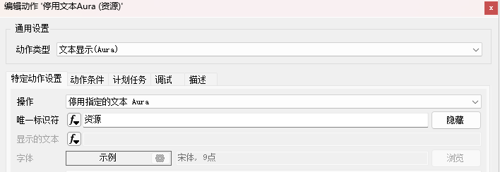 下面新建动作,类型还是文本显示(Aura),但是这回我们的操作变为了停用指定的文本Aura: